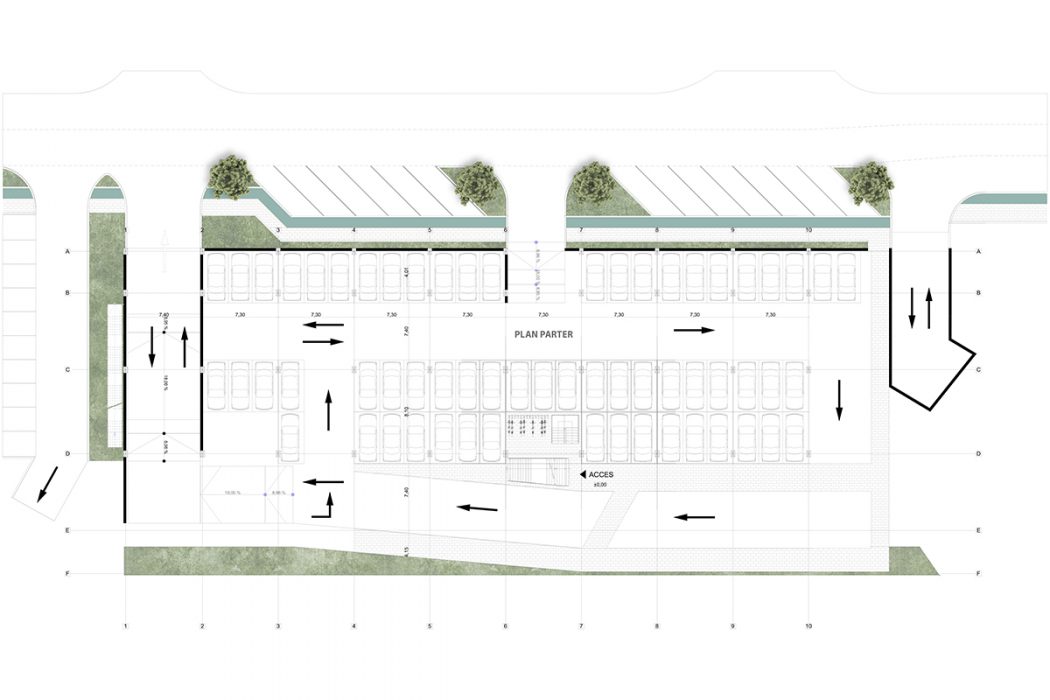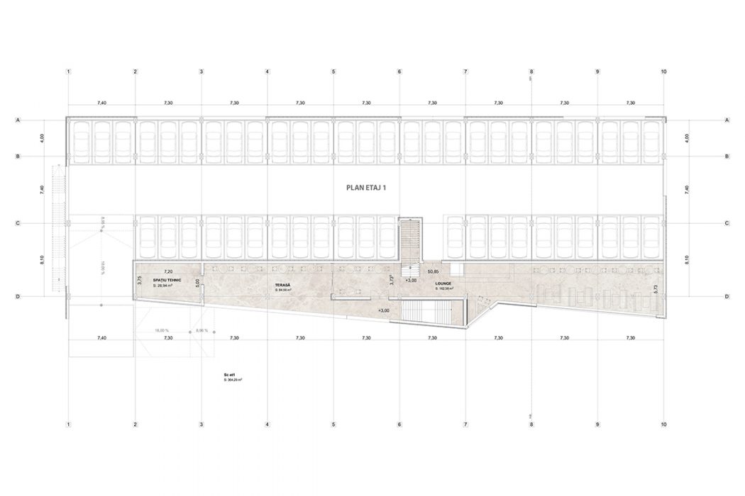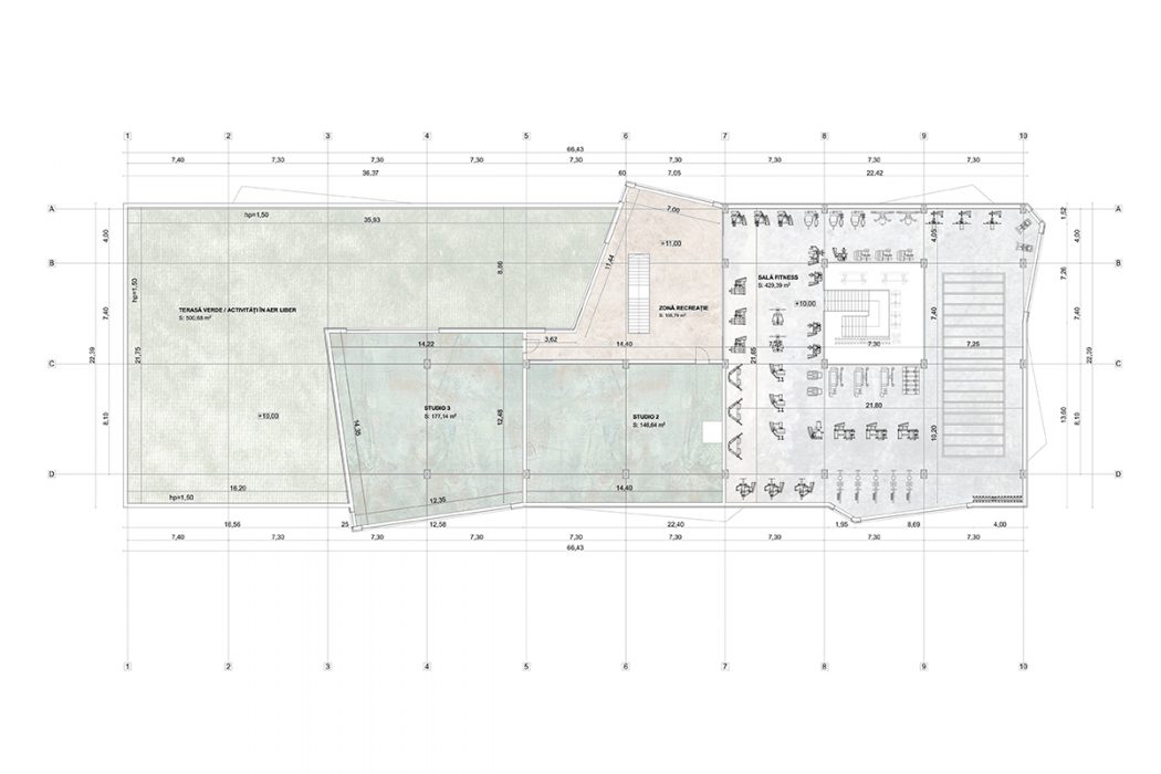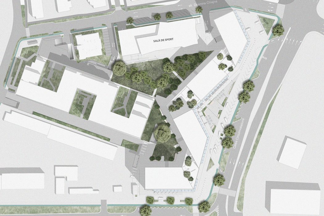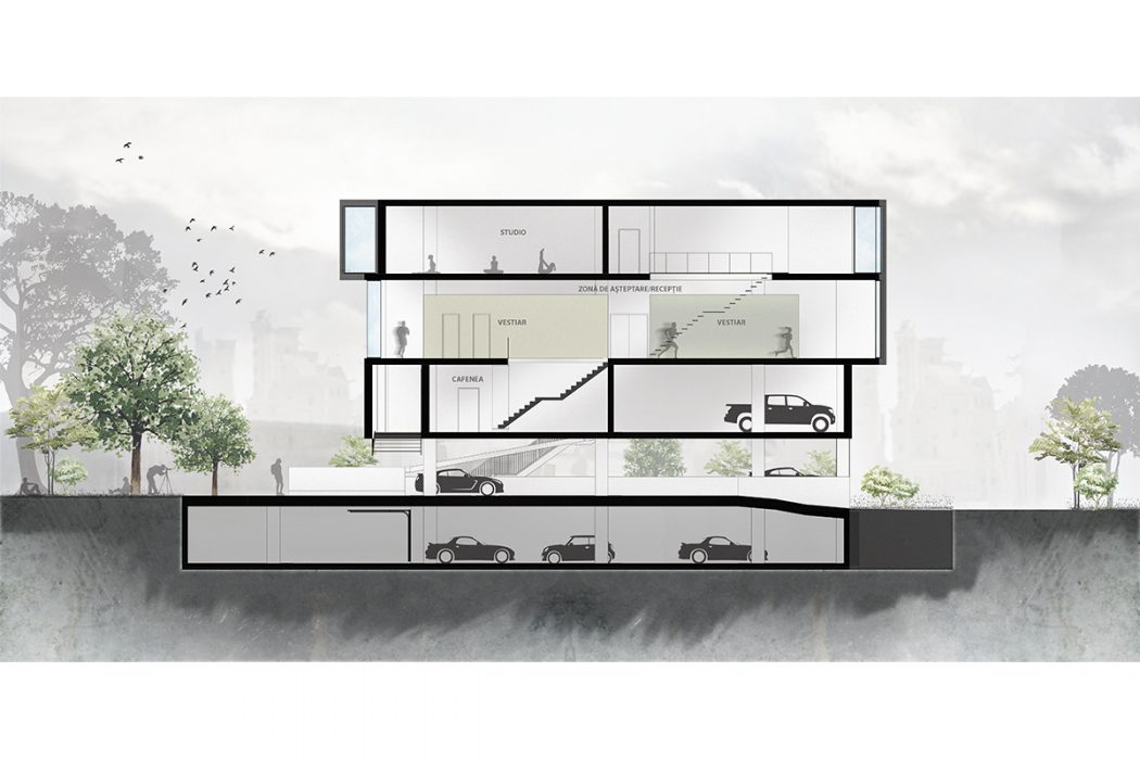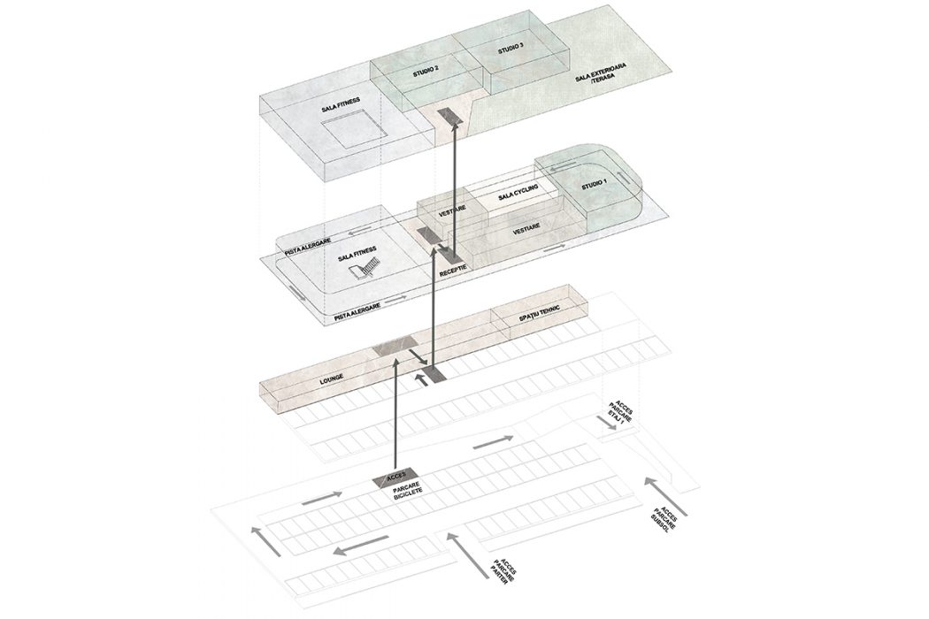 From a functional point of view, we proposed a cafe, with generous glazed areas, facing the park, a fitness area and various spaces for group sports activities (cycling, yoga, aerobics, etc.), and on the last level a green terrace for outdoor sports activities. The most important aspect of this proposal is the indoor running track, which surrounds all the halls, with a visual relationships between the track and the activities inside the halls, respectively the with the exterior. In this sense, we have proposed a series of glazed consoles, designed as rest areas, oriented towards key points of the whole or its surroundings.